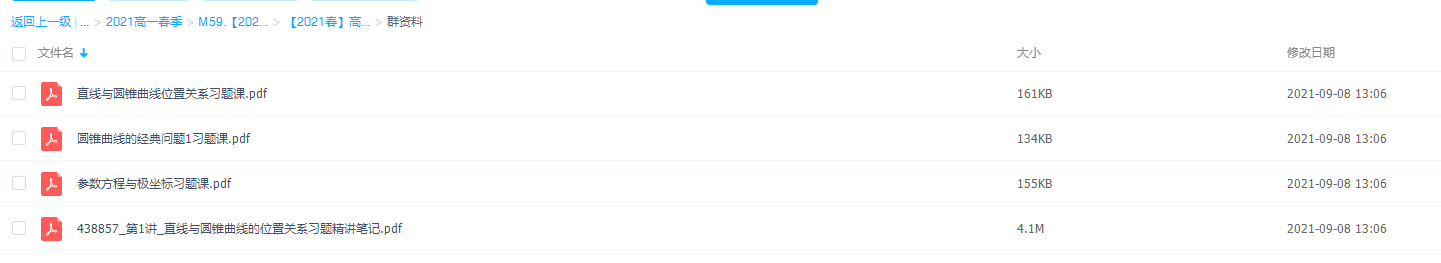 此课件来自于学而思网校,2021春季学而思高一竞赛数学习题课-一试突破计划课程,包括课程视频回放以及课堂资料讲义。主要知识点包括直线与圆锥曲线的位置关系习题精讲、参数方程与极坐标习题精讲、圆锥曲线的经典问题习题精讲、轨迹习题精讲、圆锥曲线进阶习题精讲、圆锥曲线综合习题精讲、立体几何基本概念习题精讲、面积与体积习题精讲、空间中的距离和角习题精讲、向量法解立体几何习题精讲、立体几何综合习题精讲、排列与组合计数习题精讲、二项式定理与多项式习题精讲、概率与统计习题精讲等。讲义:参数方程与极坐标习题课、圆锥曲线的经典问题习题课、直线与圆锥曲线位置关系习题课、直线与圆锥曲线的位置关系习题精讲笔记