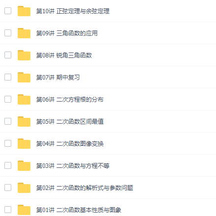 此课件来自初中数学林儒强2021初二数学春季培优创新班,此课件主要知识点包括:二次函数基本性质与图象、二次函数的解析式与参数问题、二次函数与方程不等、二次函数图像变换、二次函数区间最值、二次方程根的分布、 期中复习、锐角三角函数、三角函数的应用、 正弦定理与余弦定理、圆的基本性质、圆的基本性质拓展、与圆有关的位置关系、圆的综合应用、期末复习。