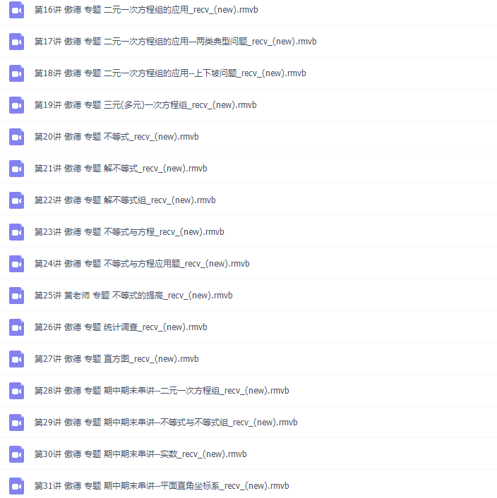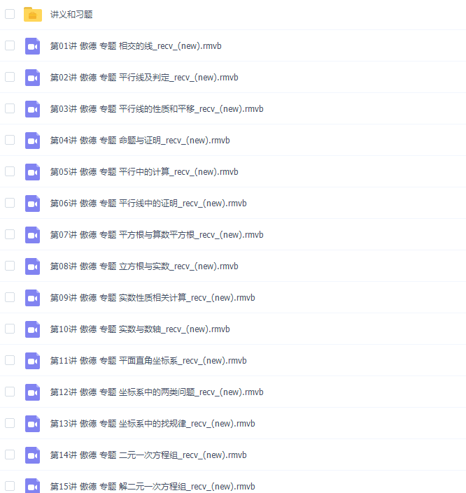 此课件来自简单学习网,傲德初一数学满分冲刺下学期课程。此课件主要知识点包括:相交的线、平行线及判定、平行线的性质和平移、命题与证明、平行中的计算、平行线中的证明、平方根与算数平方根、立方根与实数、实数性质相关计算、实数与数轴、平面直角坐标系、坐标系中的两类问题、坐标系中的找规律、二元一次方程组、 三元(多元)一次方程组、不等式、不等式与方程应用题、统计调查、直方图、期中期末串讲。