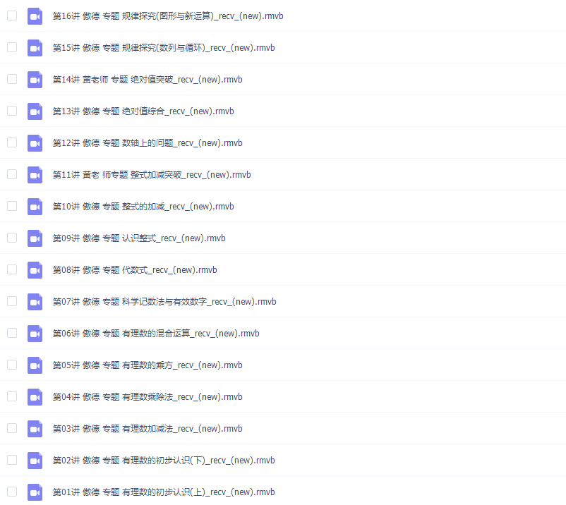 此课件来自傲德初一数学满分冲刺上学期高清视频课程,此课件主要知识点包括: 有理数的初步认识、有理数加减法、有理数乘除法、有理数的乘方、有理数的混合运算、代数式、认识整式、整式的加减、整式加减突破、绝对值综合、绝对值突破、规律探究等等视频课程。