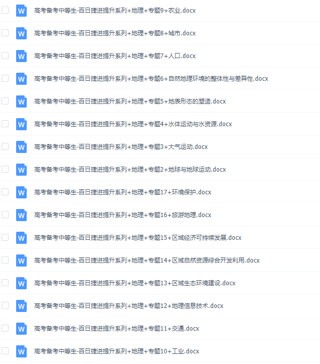 此课件来自《百日冲系列》地理中等生高考备考百日捷进Word版,此课件包含:农业、城市、人口、自然地理环境的整体性与差异性、地表形态的塑造、水体运动与水资源、大气运动、环境保护、旅游地理、交通、公园、地理信息技术等等知识点。