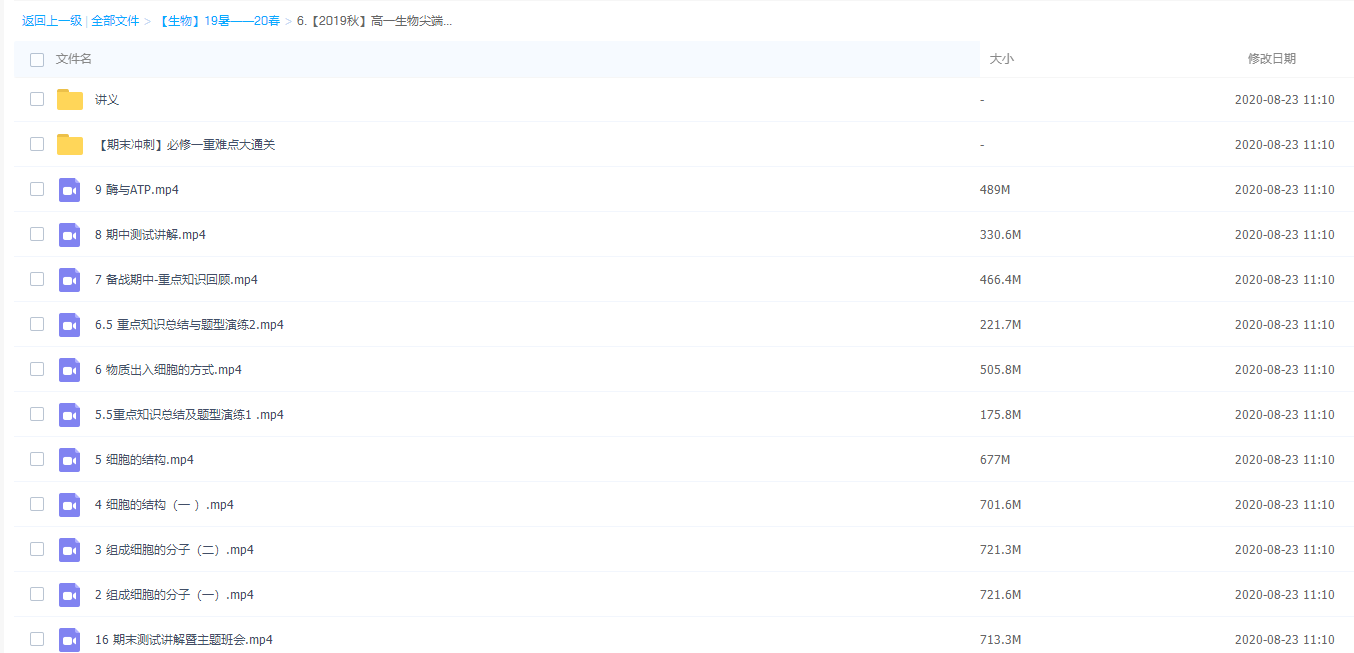 此课件来自作业帮网校,高一生物尖端班19-20学年直播课四季完整视频,包含视频课程和讲义资料 。主讲段瑞莹老师在课程中渗透培养学生“构建知识体系”的生物学习能力,教授学生合理“分类刷题”的做题练习方法,实现生物稳步提升。此课件主要包括:高一生物尖端班(19暑假班)、高一生物尖端班(19秋季班)、高一生物尖端班(20寒假班)、高一生物尖端班(20春季班)。
