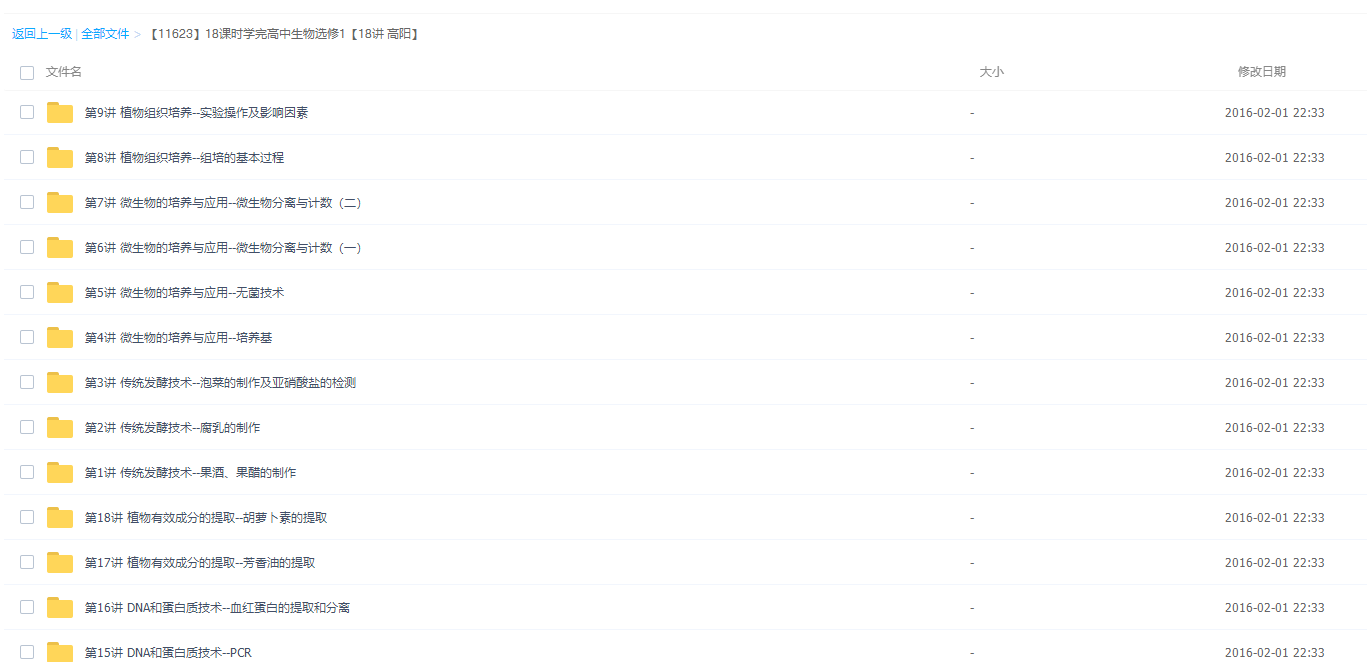 此课件来自学而思网校,高三高阳高中生物选修1全套教学视频。此课件主要知识点包括:传统发酵技术相关知识点、植物组织培养相关知识点、酶的研究与应用相关知识点、DNA和蛋白质技术相关知识点、微生物的培养与应用相关知识点、植物有效成分提取等视频课程。