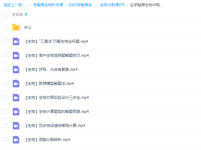 此课件来自学魁榜网校,2020生物胡忠林冲刺课8节完。此课件主要知识点包括:细胞分裂辨析、四步完成遗传推导计算、生物计算题型的解题思路、生物对照实验设计三步走、联想模型解题法、呼吸、光合有套路、高中生物选择题解题技巧、“三看法"巧解生物坐标题。