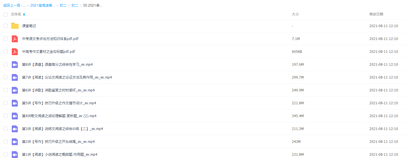 此课件来自高途课堂,高途2021年初二语文暑期班(王先意完结),包含视频课程和讲义资料 。 此课件主要内容包括:写作技巧升级之开头结尾、散文阅读之词句理解题.赏析题、阅读新闻阅读与写作、写作主题写作之传统节日等视频